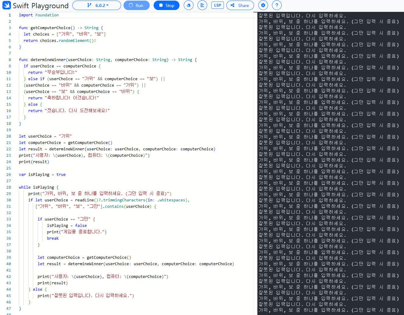 - 사용자가 "그만"을 입력할 때까지 계속 게임을 진행하는 반복문을 추가.