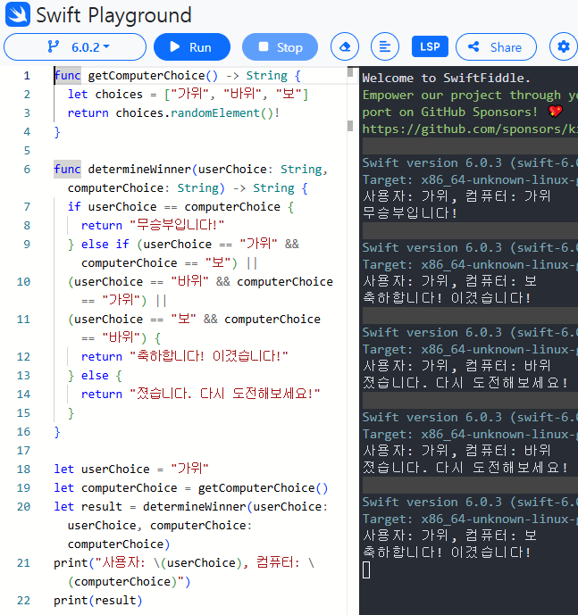 - 사용자와 컴퓨터의 선택을 비교하여 승패를 판별하는 로직을 작성.