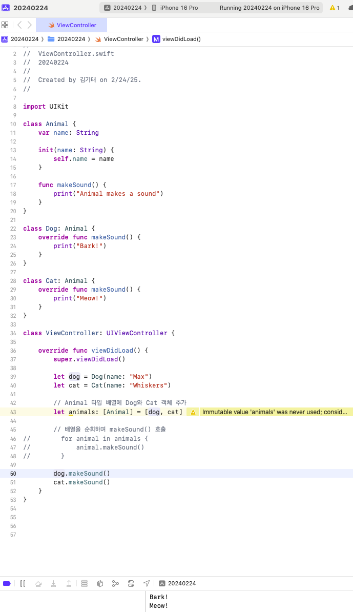 * 경고는 Animal 타입 배열이 선언되었지만 사용되지 않았기 때문에 발생.