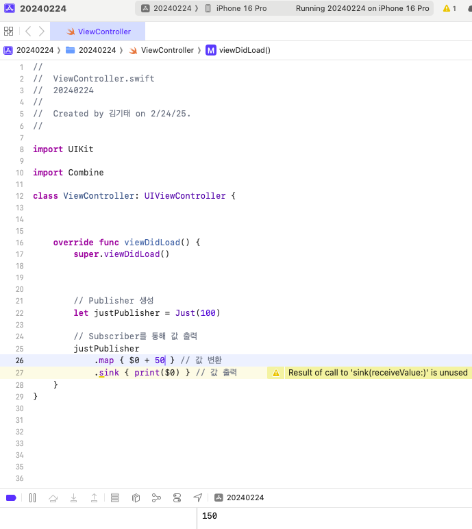 단일 값 100을 제공하는 Just를 사용하여 값을 변환(+50)하고 출력하세요.
