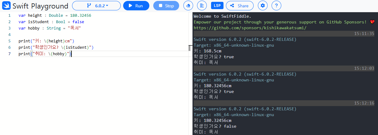 * 다행히 Swift Fiddle이란 곳을 찾아서 실습을 해볼 수 있었음