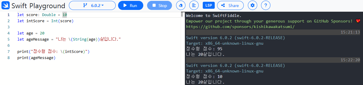 let ageMessage = "나는 \(String(age))살입니다." // 정수를 문자열로 변환