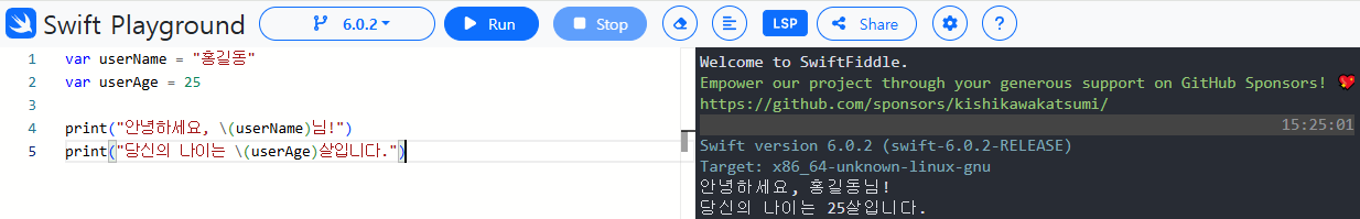 print("안녕하세요, \(myName)님! Swift Playgrounds에 오신 것을 환영합니다!")