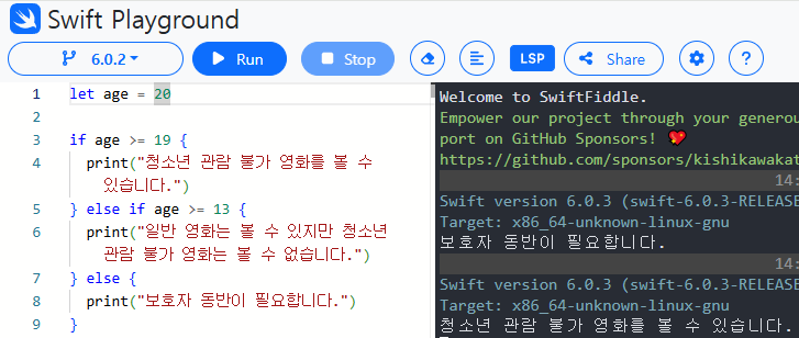 - 나이가 13세 이상이면 "일반 영화는 볼 수 있지만 청소년 관람 불가 영화는 볼 수 없습니다." 출력