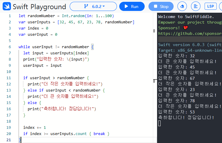 - 정답을 맞히면 "축하합니다! 정답입니다!" 출력 후 종료