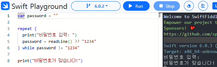 문제 4 : 비밀번호 맞출 때 까지 반복(repeat-while 사용)