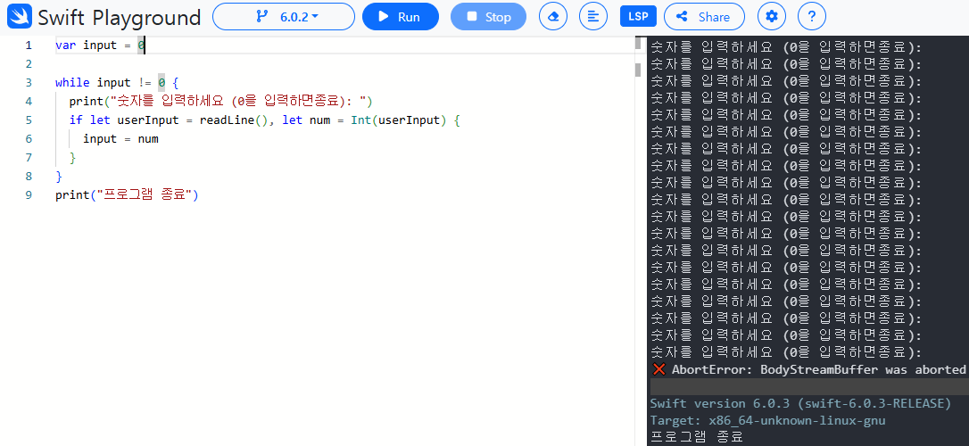 print("숫자를 입력하세요 (0을 입력하면 종료): ")