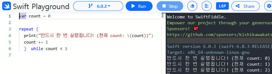print("반드시 한 번 실행됩니다! (현재 count: \(count))")